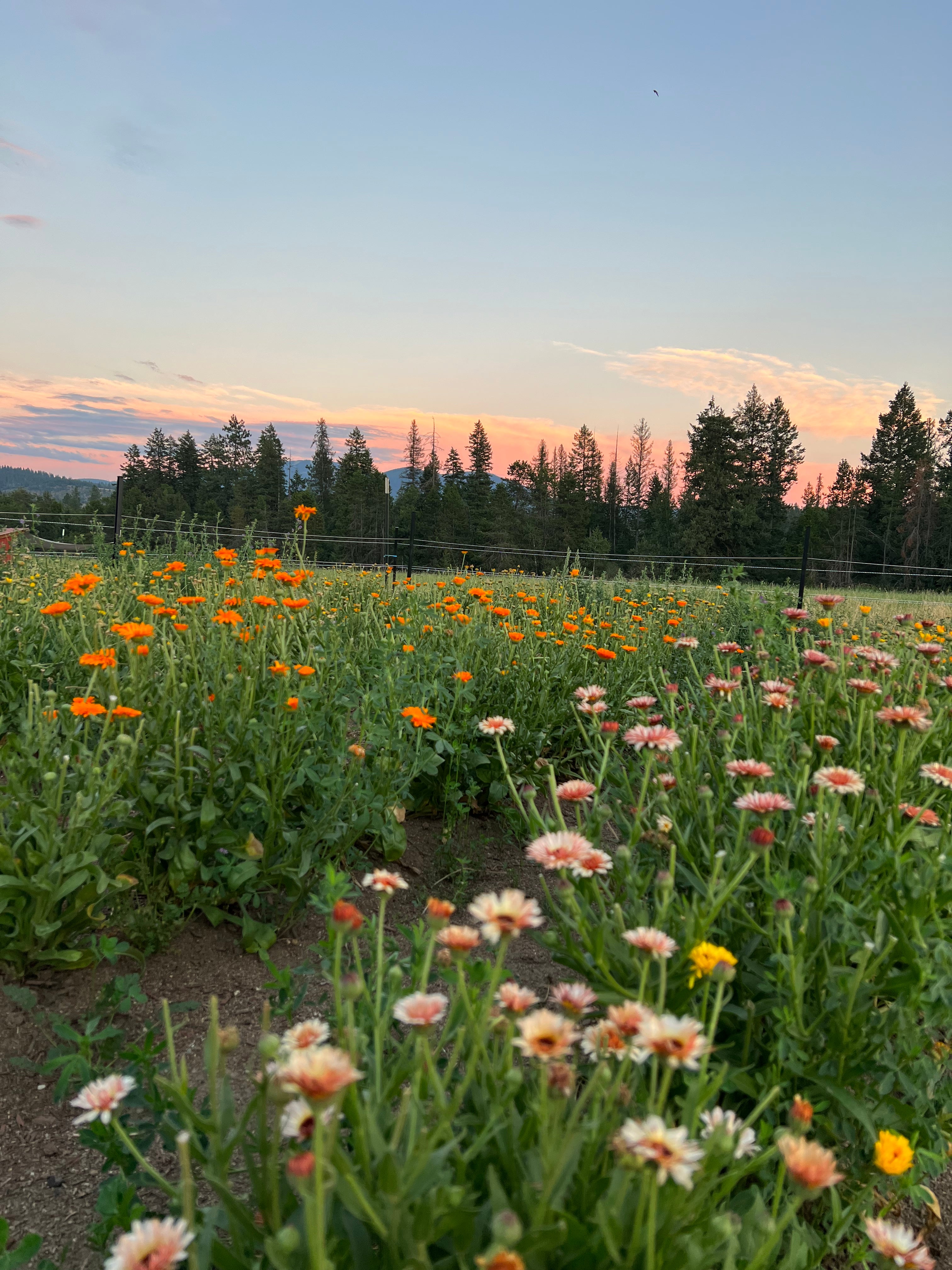 Our property is made up of 7 acres of alfalfa hay, 3 acres of forest, and a seasonal creek. We have a large garden where we grow as much food as we can in our short and sweet growing season. The calendula flowers we use for our products do especially well in our climate and we are planning to grow lavender as well. We do not use pesticides, sprays, and only a minimal amount of organic fertilizer.