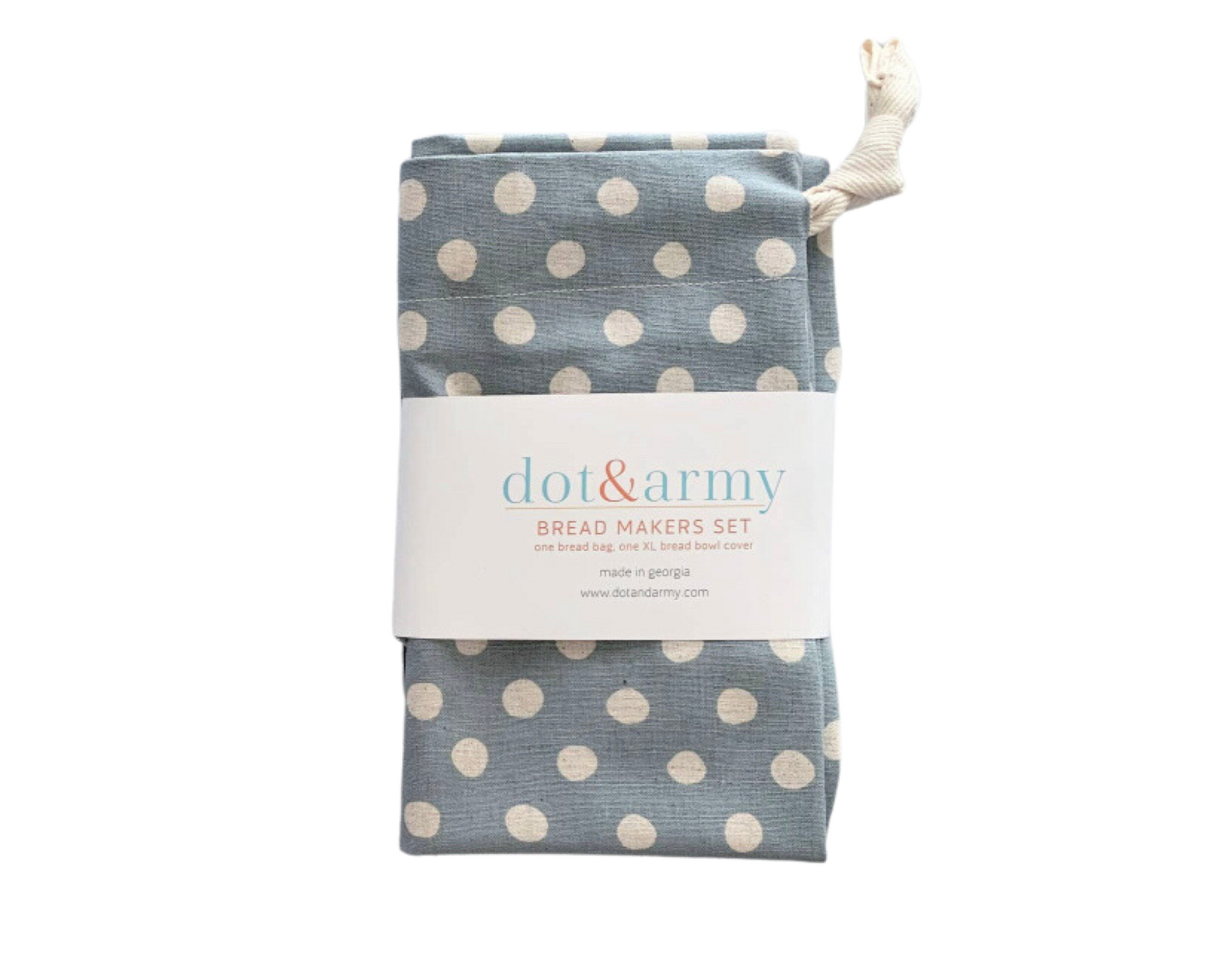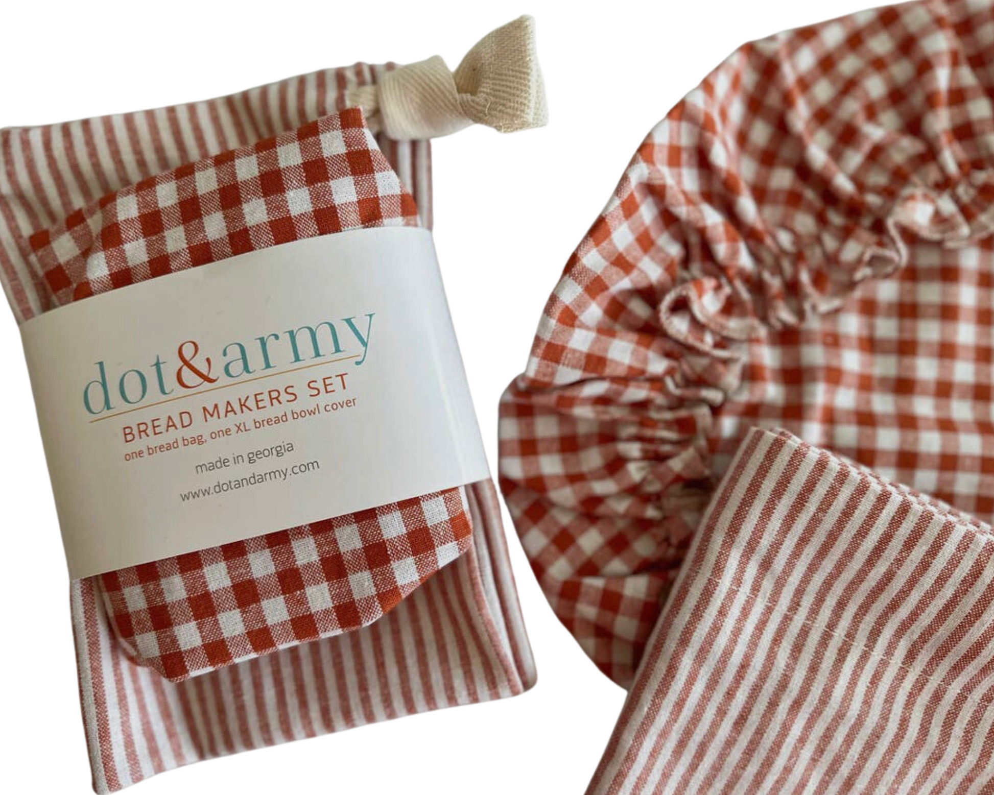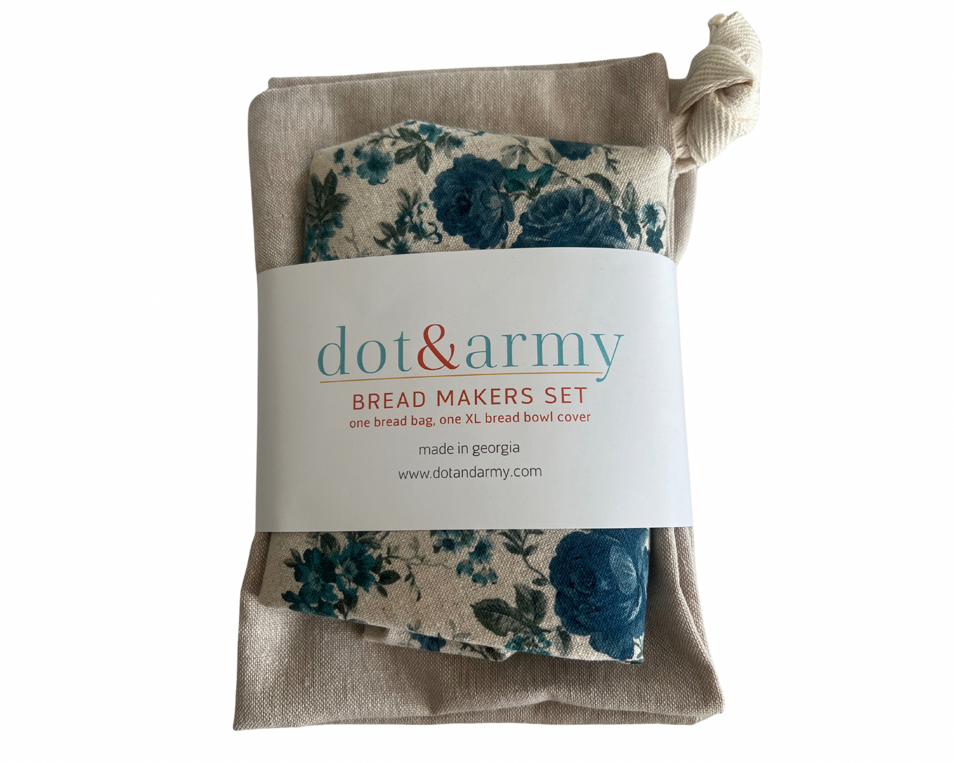100% cotton, fits ups to a 16 inch bowl, and bread bag is 12x16 inches and closes with a drawstring.