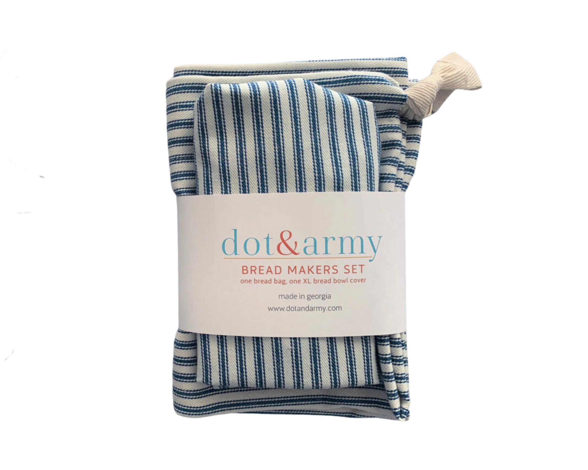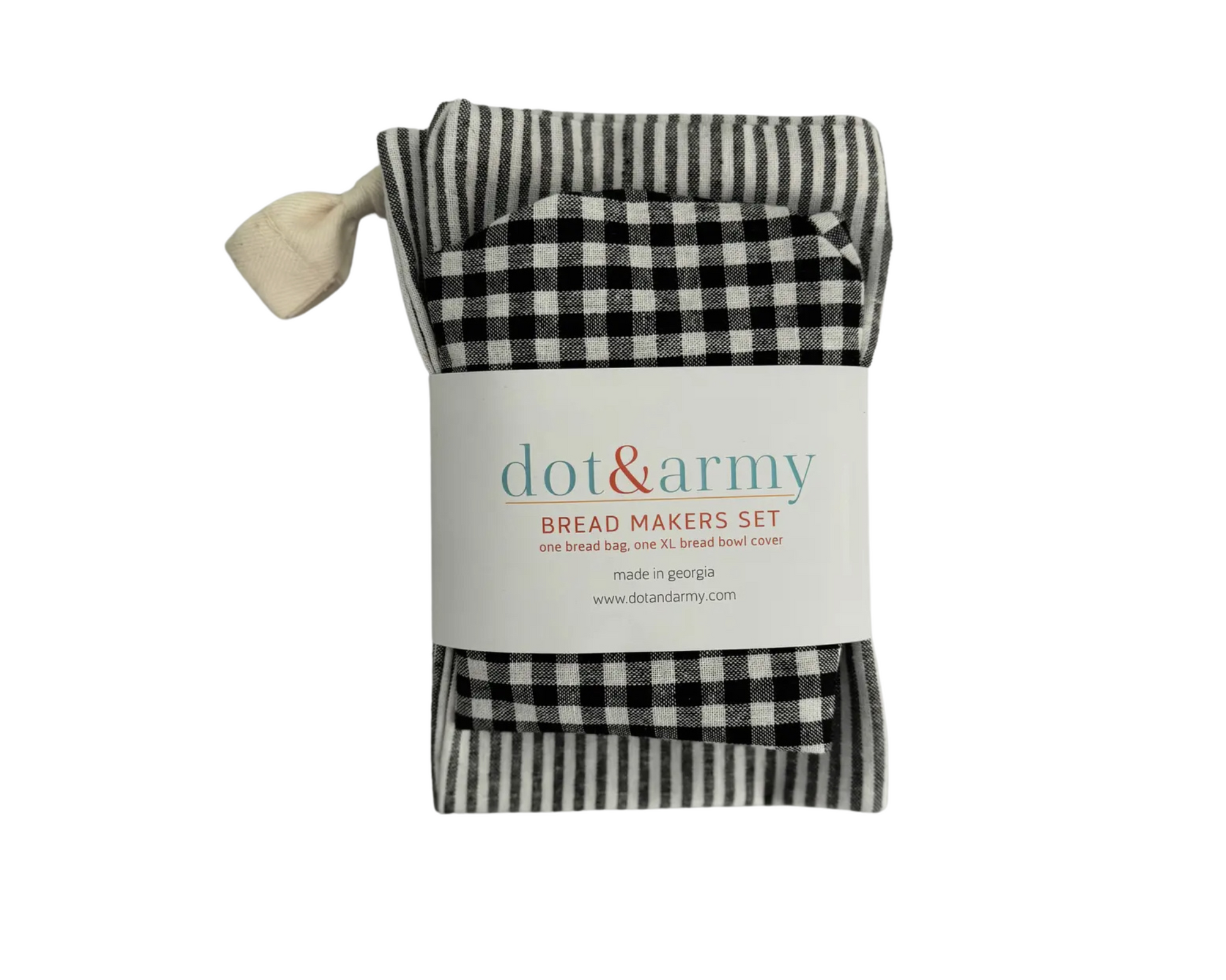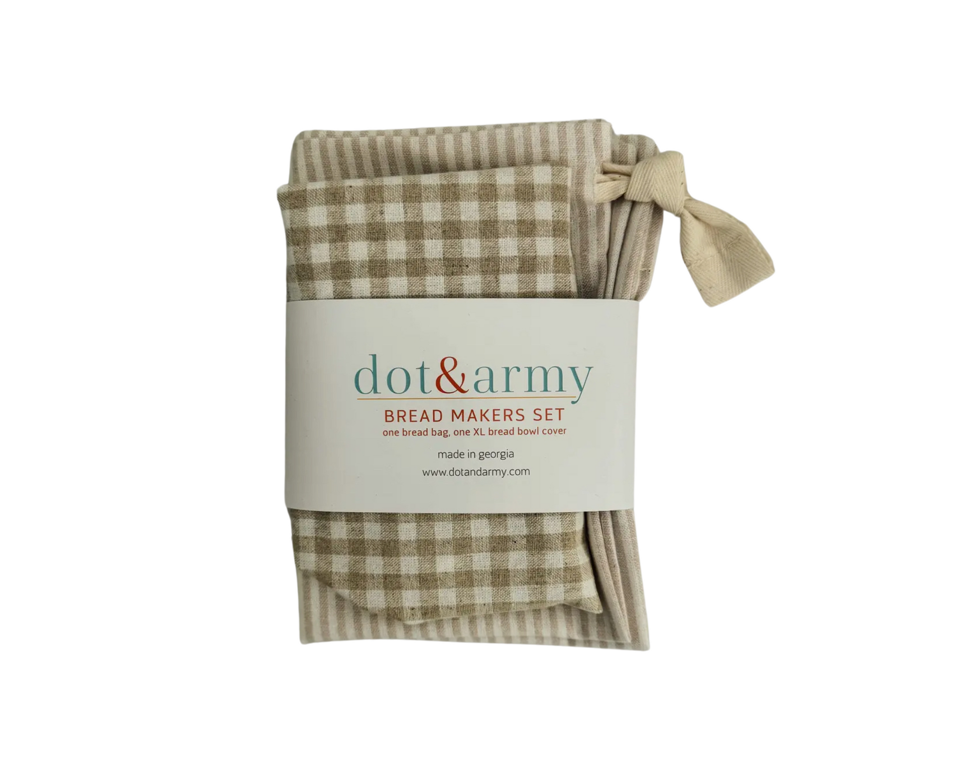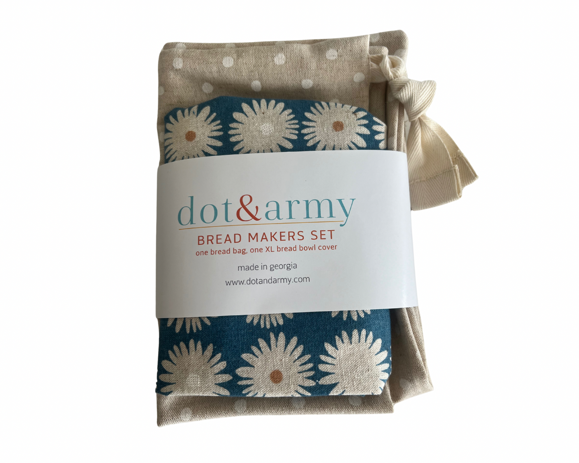 100% cotton, fits ups to a 16 inch bowl, and bread bag is 12x16 inches and closes with a drawstring.